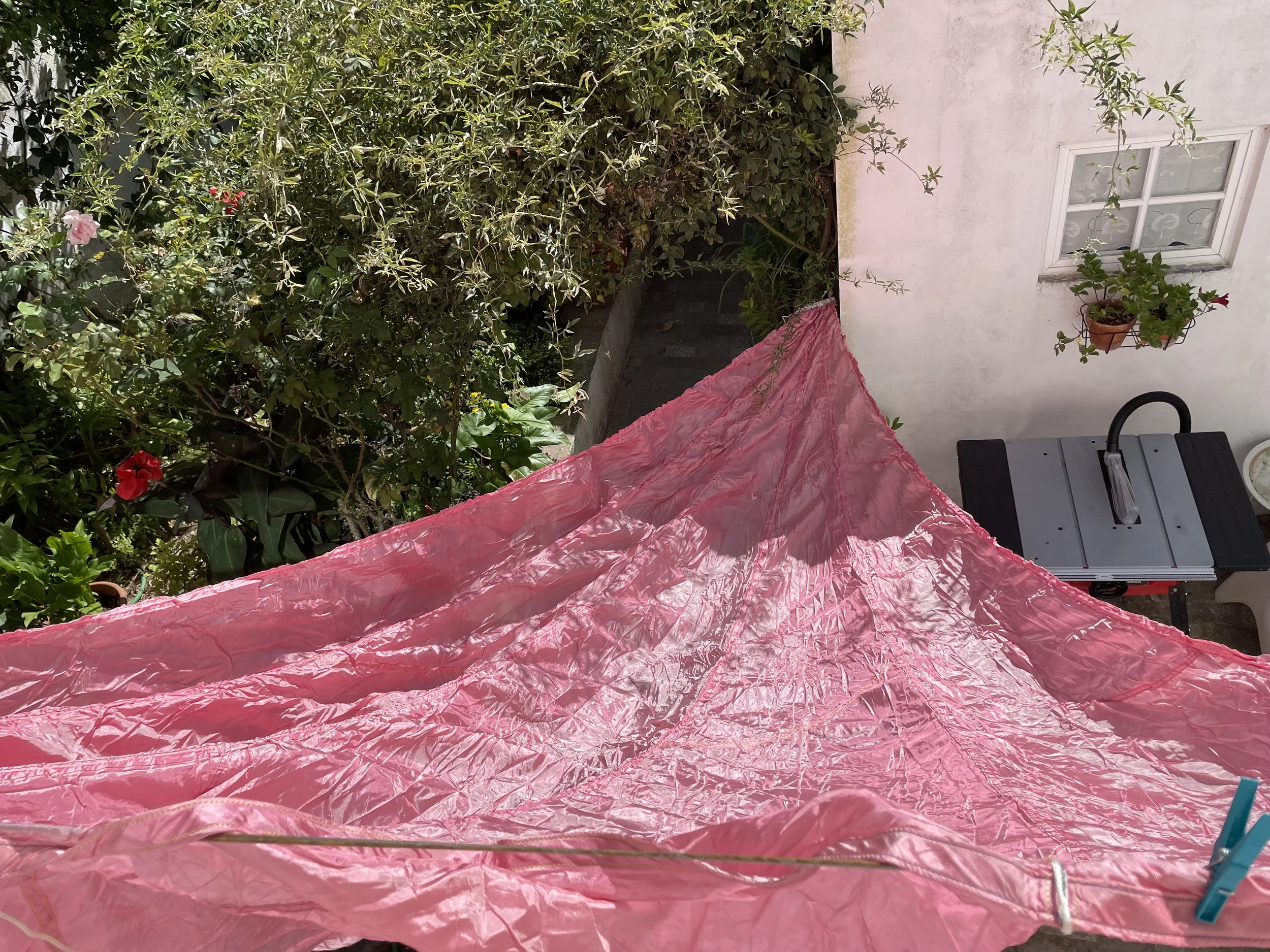 I am starting this project up-cycling a 1960’s Ex Cargo military pink parachute [G. I. Joe Army Stores Wholesale Ltd] as a source for materials.